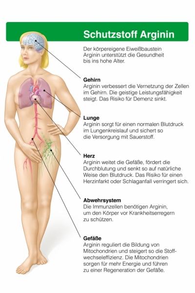 - Weil der erwachsene Körper nur noch geringe Mengen bildet - und der Bedarf mit zunehmendem Lebensalter ansteigt. Mit Lebensmitteln wie Nüssen, Hülsenfrüchten oder rotem Fleisch könnte man Defiziten vorbeugen. Gerade Menschen mit Bluthochdruck, Adernverkalkung oder Diabetes nehmen meist jedoch über die Nahrung nicht genug auf. Dann sollten sie gut verträgliches Arginin einnehmen - etwa 'Telcor Arginin plus' (rezeptfrei Apotheke), um ihre Gefäße länger gesund und elastisch zu erhalten.